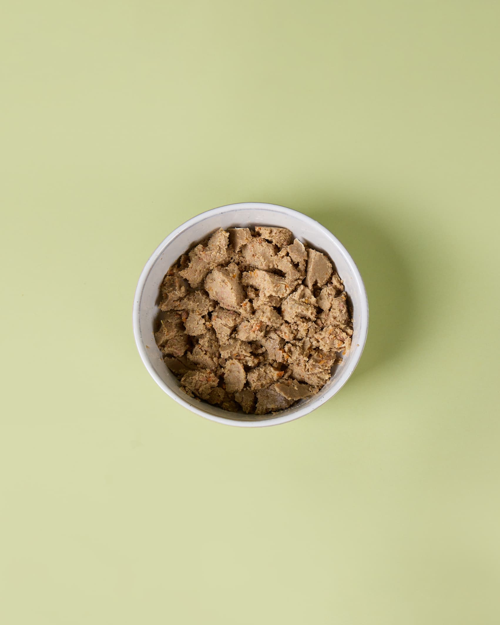 A blend of finely chopped lamb with added chicken, and mixed veggies, cooked in bone broth.