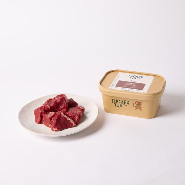 Grass fed lean prime beef in bite sized chunks.