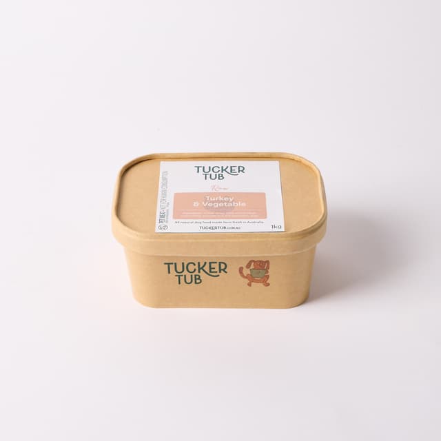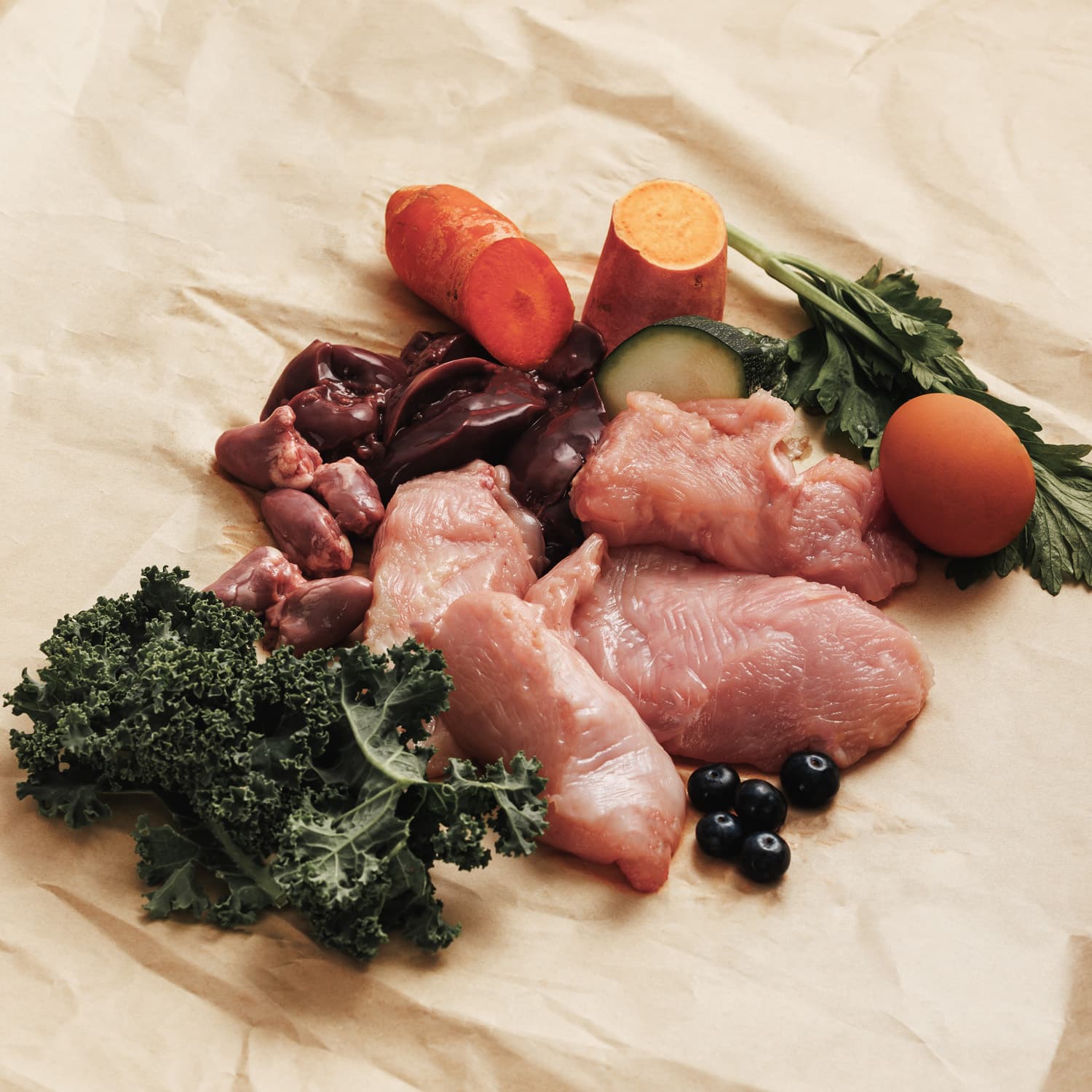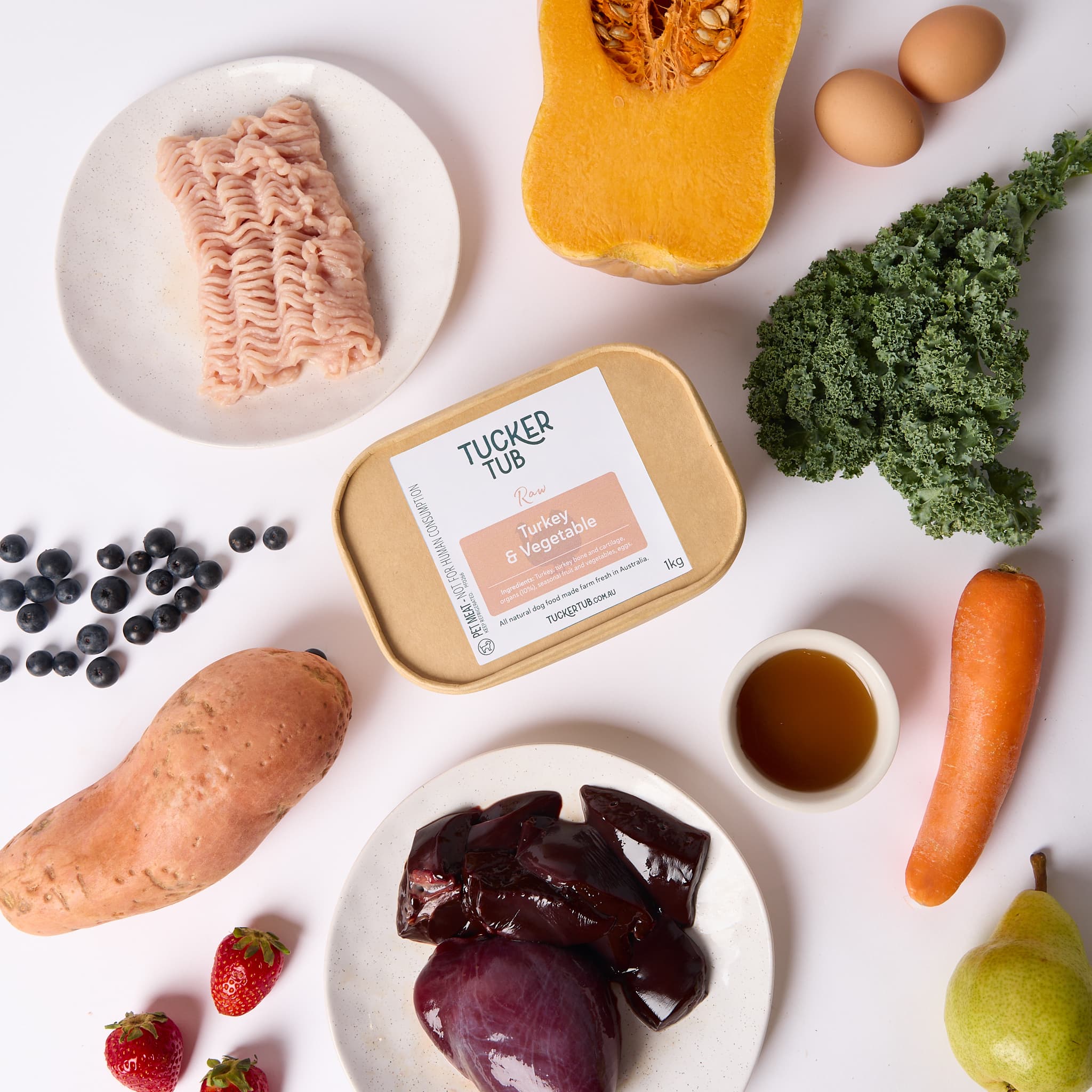Turkey, turkey bone and cartilage mix, organ mix (10%), seasonal fruit, seasonal vegetables, eggs.